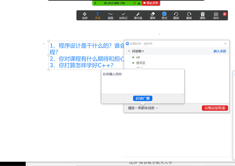沈老师认为,与线下教学相比,有效的交流互动对于线教学更加必要。除语音问答外,还可充分利用Zoom中的举手、多方注释、参会者共享屏幕等功能方便地实现类似线下教学的相应功能。在需要组织学生分成小组在线讨论时,Zoom的“分组讨论”功能可满足要求。在此场景中,教师还可以自由地加入某个小组参与学生的讨论,如图2所示。
