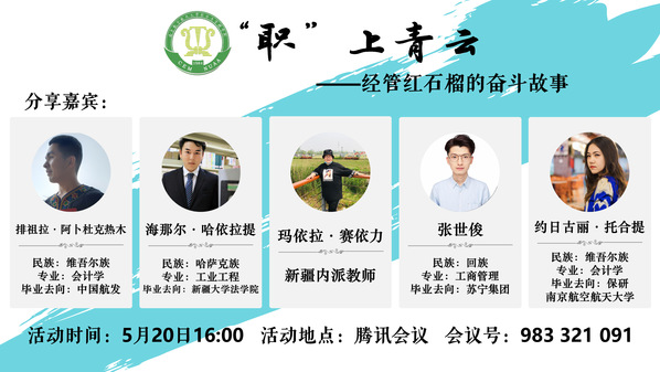5月20日,必赢线路检测3003no1举办“‘职’上青云职业素质训练营——经管红石榴的奋斗故事”交流分享会,活动采取线上线下相结合的形式,邀请新疆内派教师玛依拉•赛依力以及16级优秀毕业生针对新疆籍少数民族学生的职业生涯规划进行专题分享, 40余名学生参与本次交流会。