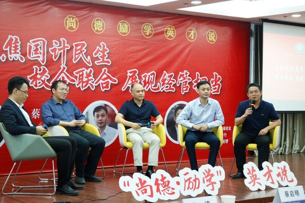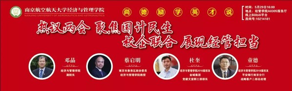 5月29日下午,必赢线路检测3003no1于A0305 报告厅举行“尚德·励学”英才说校友师生共话两会活动。学院副院长邓晶,南京市秦淮区政协委员、管理科学与工程系教授蔡启明,我校2010届校友、金城集团党建文宣群工部部长杜奎,我校2018届校友、平安银行南京分行战略客户二部总经理童德,共同围绕“热议两会,聚焦国计民生;校企联合,展现经管担当”主题与学院师生展开交流讨论。