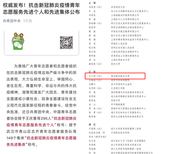 近日,为褒扬广大青年志愿者和志愿者组织在抗击新冠肺炎疫情这场严峻斗争中的突出表现,经党中央批准,共青团中央、中国青年志愿者协会授予295人“抗击新冠肺炎疫情青年志愿服务先进个人”称号,授予149个集体“抗击新冠肺炎疫情青年志愿服务先进集体”称号。必赢官网王小珂同学荣获“抗击新冠肺炎疫情青年志愿服务先进个人”称号。