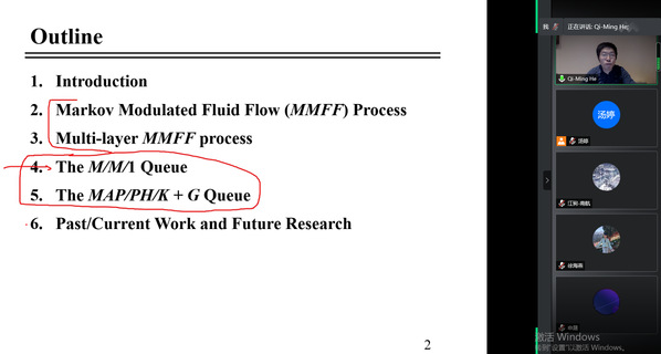 在本次学术讲座中,Qi-Ming He 首先介绍了多层马尔可夫调制流体流(MMFF)过程的基本理论和算法,然后介绍了三个基本量,并给出了MMFF过程的平稳分布。接下来演示了如何使用MMFF过程来分析排队模型,包括客户遗弃的排队系统。最后介绍了自己在该方向的研究进展。