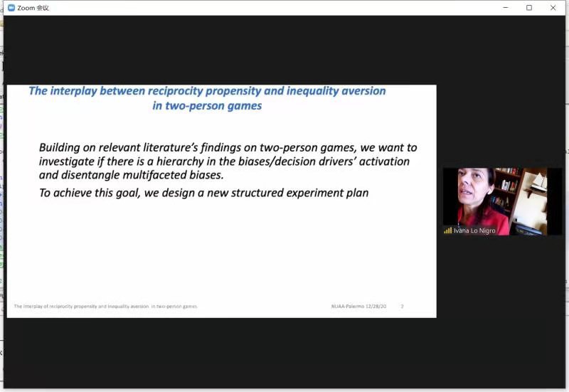 12月28日下午,意大利巴勒莫大学教授Giovanna Lo Nigro受学院智能决策与风险分析研究所邀请,在ZOOM会议作了题为“The interplay of reciprocity propensity and inequality aversion in two-person games”的学术报告。必赢官网徐海燕教授、何沙玮副教授等教师及部分硕、博研究生线上参加了Giovanna Lo Nigro的报告分享,本次学术报告由何沙玮主持。