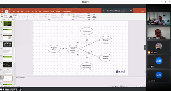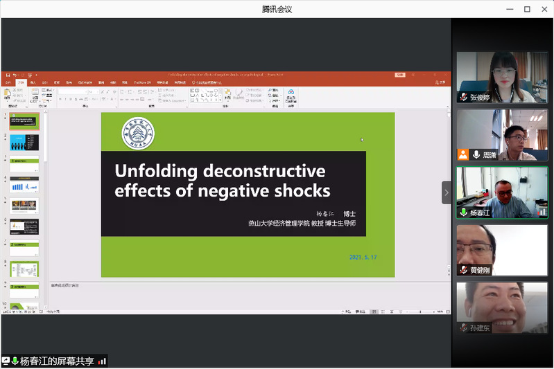 5月17日,燕山大学经济管理学院教授杨春江应必赢线路检测3003no1人力资源管理研究所和江苏省人力资源发展研究基地的邀请,在线上作了题为“消极震撼事件的影响及机理研究——基于服务业一线员工的调查”的精彩学术报告。本次报告由教授胡恩华主持,年轻教师、博士生和硕士生参加了此次学术报告活动。