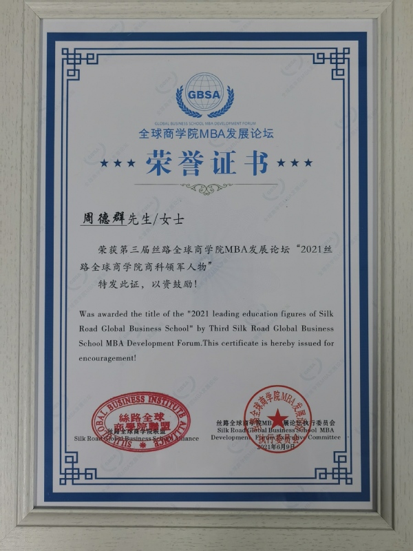 必赢线路检测3003no1院长、长江学者特聘教授周德群获得“2021丝路全球商学院商科教育领军人物”