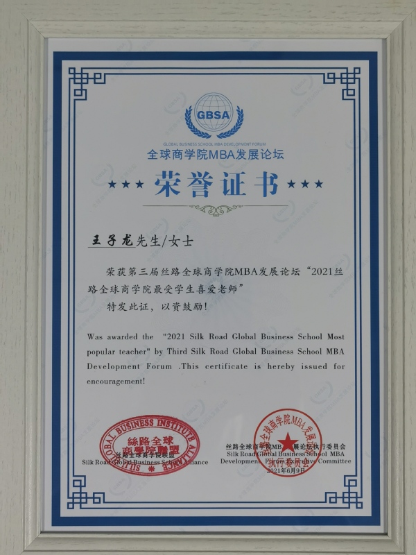 必赢线路检测3003no1副院长王子龙获得“2021丝路全球商学院最受喜爱老师奖”