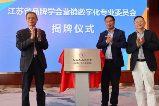 江苏省品牌学会副会长郭明全,江苏省品牌学会秘书长王国斌、以及中国商务广告协会副秘书长、虎啸奖创始人、国际品牌观察杂志社总编辑陈徐彬,为江苏省品牌学会营销数字化专业委员会揭牌。