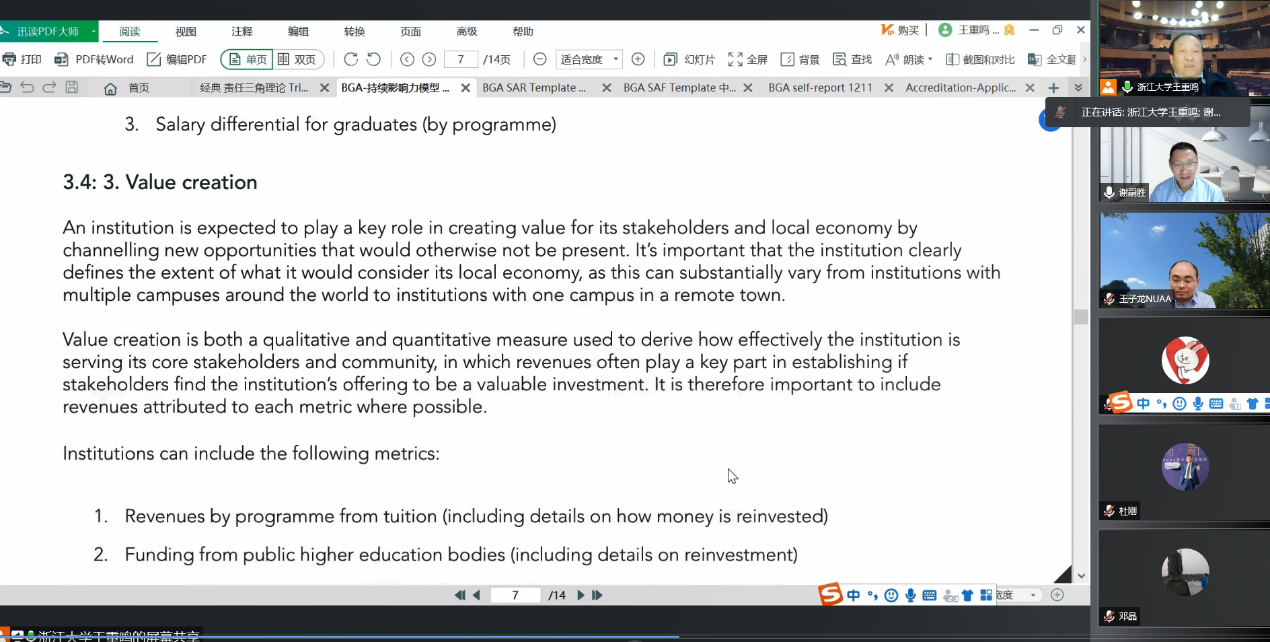 12月21日晚,国际工商管理认证协会(AMBA)中国区总负责人、浙江大学文科资深教授、浙江大学全球创业研究中心主任王重鸣教授应邀指导必赢官网BGA认证工作。因疫情防控需要,本次会议在线上召开。必赢线路检测3003no1院长周德群、党委书记苏州、学院副院长王子龙、邓晶、谢乃明、院长助理兼认证中心主任谢嗣胜、MBA教育中心执行主任杜刚以及相关专业老师参加会议。