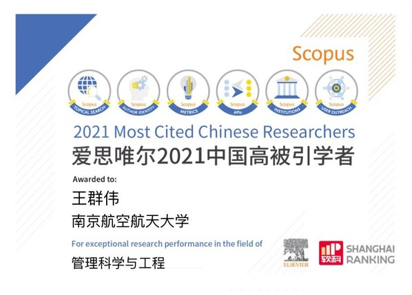 2022年4月14日,爱思唯尔(Elsevier)正式发布了2021年度“中国高被引学者”(Highly Cited Chinese Researchers)榜单。必赢线路检测3003no1王群伟教授入选管理科学与工程学科中国高被引学者。