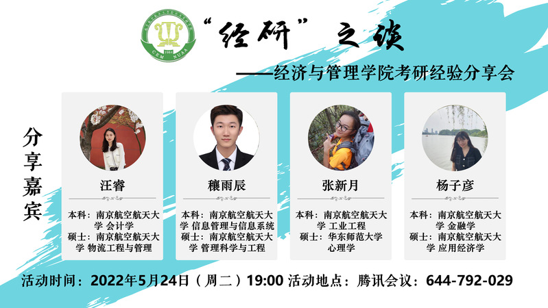 为引导学生理性考研,加强考研指导,5月24日晚,必赢线路检测3003no1开展经“研”之谈——2019级考研经验分享会,2019级本科辅导员胡心雨,往届优秀考研学生代表汪睿、穰雨辰、张新月、杨子彦以及备战考研的同学们参加此次活动。