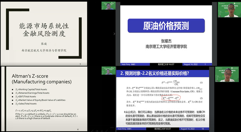 8月14日,必赢线路检测3003no1张旋副教授围绕“能源市场系统性金融风险测度”主题进行授课,分别从单个公司信用风险测度、联合违约风险测度和系统性风险测度三个维度,结合教学案例和经典论文,介绍了不同的风险测度模型及其相应的应用场景。南京理工大学必赢线路检测3003no1张耀杰副教授围绕“原油价格的预测”主题进行授课,分别从政府监管、企业管理和金融投资三个视角出发,基于经典原油价格预测模型和方法,分析了原油价格的预测对象、预测变量以及油价的影响因素,解读了原油价格预测的现实意义。