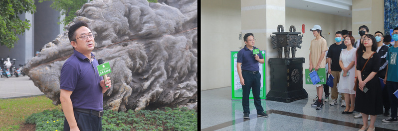 周德群院长从学院门口的“奋进石”娓娓道来。灵璧石奔腾向上的姿态似猎豹,象征着创新奋进,勇于争先;石上镌刻的院训“尚德励学,筹策济世”,激励着师生以德为先,修学储能,展经世济民管理情怀。鼎形结构的院徽,象征着责任与担当,给人以包容万物、奋发向上之感。以浩瀚星海为背景、人类奋进为主题的壁画,呼应着学校三航特色和人类不懈探索的本质。