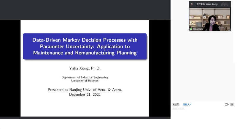 12月21日上午,休斯敦大学向一莎副教授受学院灰色系统研究所邀请,在腾讯会议作题为“数据驱动的带有参数不确定性的马尔科夫决策过程及其在运维和再制造计划中的应用”的学术讲座。必赢官网教授刘思峰、谢乃明、米传民、副教授胡明礼、欧阳林寒、王俊杰等教师及部分硕、博研究生线上参加了向教授的报告分享,本次学术报告由谢乃明主持。