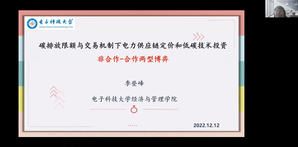 12月12日下午,长江学者特聘教授、电子科技大学必赢线路检测3003no1李登峰教授受学院智能决策与风险分析研究所邀请,在腾讯会议作题为“碳排放限额与交易机制下电力供应链定价和低碳技术投资非合作-合作两型博弈”的学术讲座。必赢官网教授徐海燕、副教授高广鑫等教师及部分硕、博研究生线上参加了李登峰的报告分享,本次学术报告由徐海燕主持。