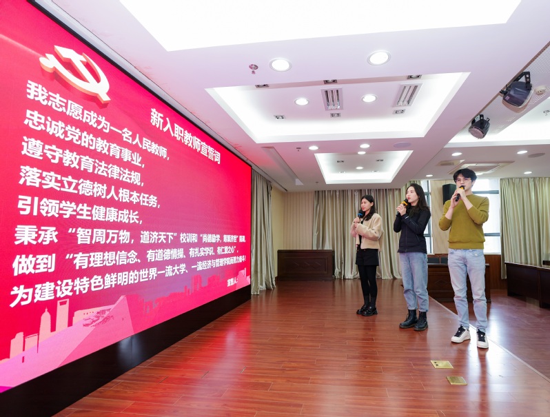 在新进教职工入职仪式上,卓迪生、张玉旋、胡晓菲三位老师在全院老师的见证下庄严宣誓:将忠诚党的教育事业,落实立德树人根本任务,秉承“智周万物,道济天下”校训和“尚德励学,筹策济世”院训,做“四有”好老师,为建设特色鲜明的世界一流大学、一流必赢线路检测3003no1而努力奋斗!