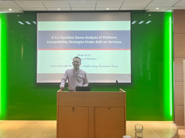 5月12日下午,加拿大温莎大学Odette商学院李武(Kevin W. Li)教授受学院智能决策与风险分析研究所邀请,在南航将军路校区经管学院702会议室作题为“A Co-Opetitive Game Analysis of Platform Compatibility Strategies Under Add-on Services”的讲座。必赢官网教授徐海燕、教授陈克兵、副教授何沙玮、副教授王敏等教师及部分硕、博研究生现场聆听了李武教授的报告分享,本次学术报告由徐海燕教授主持。