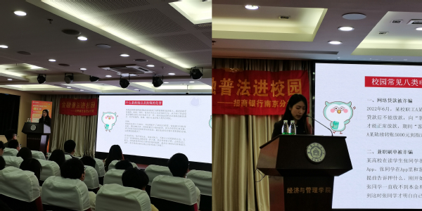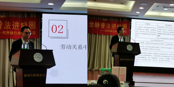 接着招商银行南京分行法规部王玮重点普及了法律常识,围绕就业法律政策进行深入剖析,为即将毕业的学生提供了就业指导和法律方面的建议。