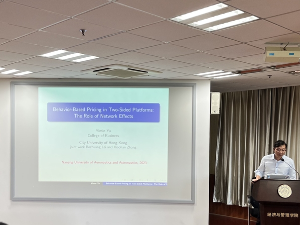 香港城市大学虞义敏副教授作题为“Behavior-Based Pricing in Two-Sided Platforms: The Role of Network Effects”的学术报告,虞教授首先利用Uber、YouTube等例指出目前采用行为定价策略的双边平台没有考虑交叉网络效应的局限性,然后通过建立双寡头两阶段模型研究了行为定价策略在连接双边平台所起的作用,最后通过研究揭示了定价策略在双边平台的盈利能力以及交叉网络效应。