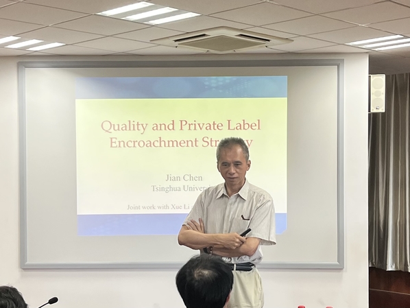 清华大学陈剑教授作题为“Quality and Private Label Encroachment Strategy”的学术报告,陈教授通过建立消费者效用函数考虑了不同质量定位下引入自有品牌对供应链的影响,结果发现,零售商引入高质量自有品牌时反而有利于制造商和零售商,并提升消费者剩余。