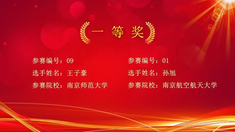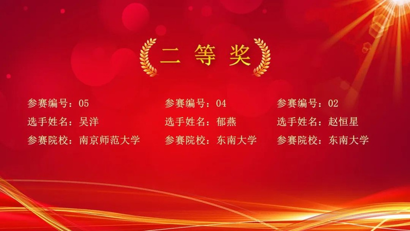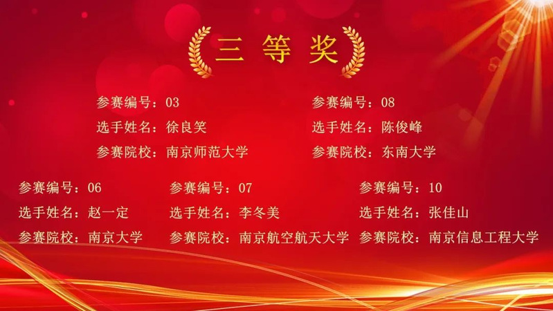 最后,在大家的共同见证下,颁奖盛典正式公布个人荣誉奖项和团队荣誉奖项获奖名单。南京师范大学王子豪、必赢线路检测3003no1孙旭荣获一等奖;南京师范大学吴洋、东南大学郁燕、赵恒星荣获二等奖;南京师范大学徐良笑、东南大学陈俊峰、南京大学赵一定、必赢线路检测3003no1李冬美、南京信息工程大学张佳山荣获三等奖。南京师范大学获得团队一等奖,东南大学获得团队二等奖,必赢线路检测3003no1获得团队三等奖。