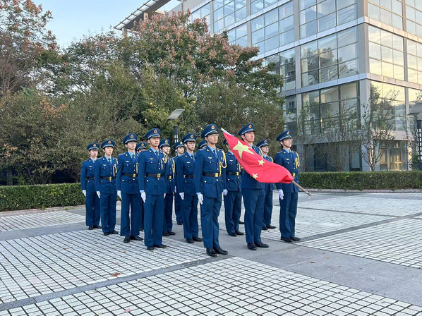 铿锵正步踏碎晨曦寂静,嘹亮口号喊醒内心灵魂。清晨七时整,升国旗仪式正式开始。国旗仪仗队的同学们迈着整齐划一、铿锵有力的步伐,护送着五星红旗正步走向旗杆。全体师生面向国旗肃立致礼。随着激昂的《义勇军进行曲》,师生们注视着五星红旗冉冉升起,在熠熠晨光中迎风飘扬。