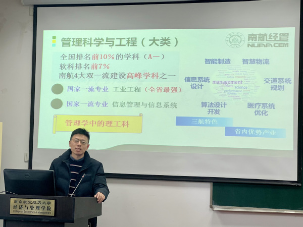 陈剑与罗正军老师分别对工业工程与信息管理与信息系统专业展开介绍。陈剑讲道,工业工程是经管学院的起家专业,经过多年发展与积累,实力雄厚,具有优秀的师资队伍、科学合理的人才培养体系、丰富的科研竞赛和实习资源等,增强同学们对工业工程的专业认知。罗正军从信管专业的产生背景说起,并提出在智能制造背景下,工业工程学生和信管学生应该互相学习,努力成为一名综合型人才;罗老师介绍信管专业就业前景的同时,也客观提醒同学们学习信管专业,需要攻坚克难的决心和学深学透的毅力。