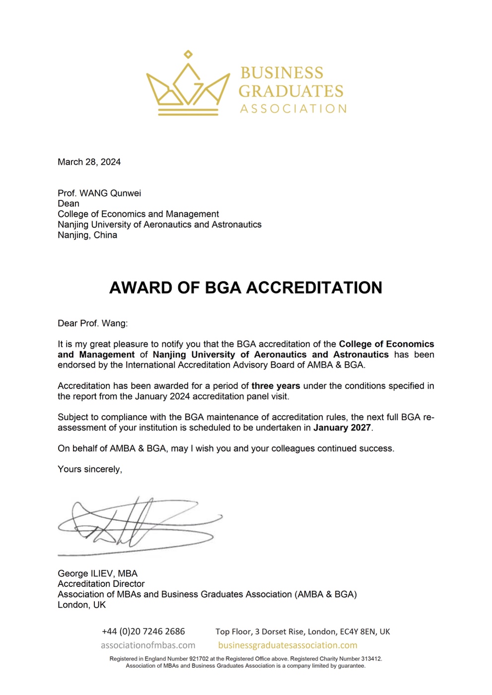 近日,必赢线路检测3003no1收到英国商学院毕业生协会(Business Graduates Association,简称BGA)发来的官方贺信,祝贺学院顺利通过BGA国际金牌认证,这是我校学院层面的首项国际商科认证。